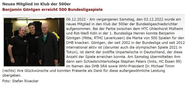 Der WHV-Schiedsrichter- und Regelausschuss (WHV SRA) gratuliert Benjamin Göntgen (RTHC Leverkusen) zu 600 und Michelle Meister (Köpenicker HU) zu 400 geleiteten Bundesligaspielen. Damit erreichte Benjamin Göntgen als erst vierter Schiedsrichter in der Geschichte der Bundesliga die beeindruckende Marke von 600 Spielen – eine Leistung, die vor ihm nur Frank Lubrich, Carsten Großmann-Brandis und Christian Blasch gelungen ist.
